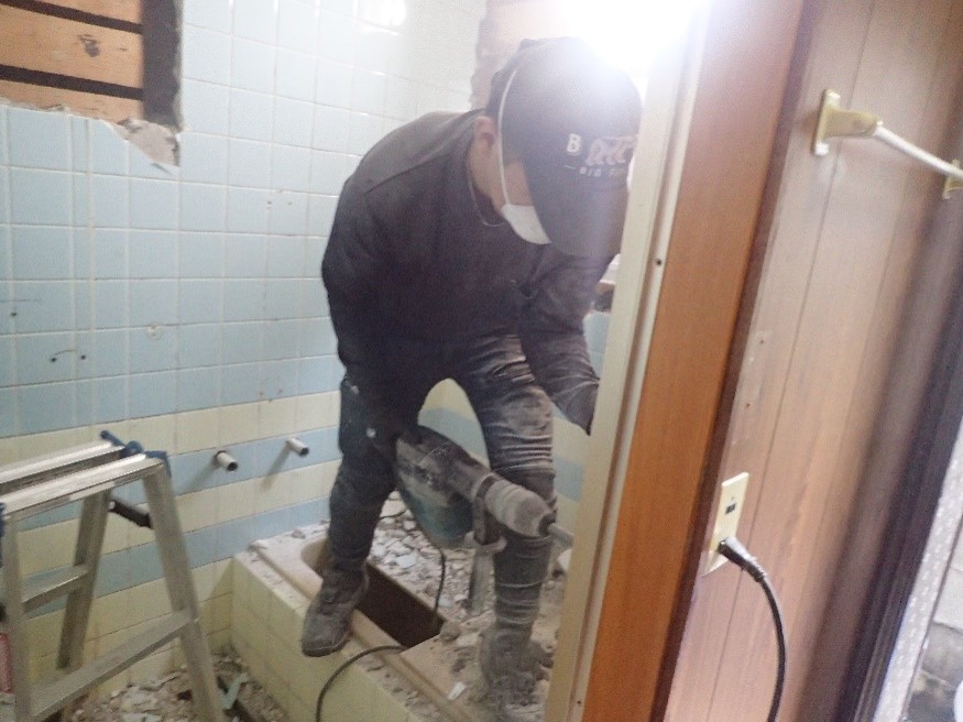 | システムバス化に伴い、まずは浴室内の壁タイルを斫って行きます。 |