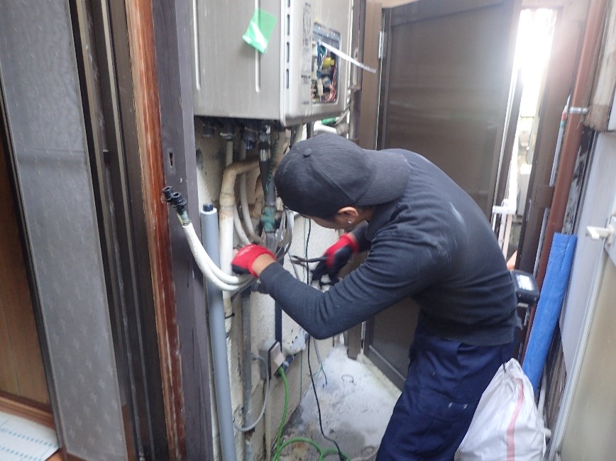 | 今回っ給湯器は取替えませんので、配管を新しく新設します。 洗濯機も脱衣室で使用できるよう、専用の給水配管と排水管を床下にもぐり、新設します。 |