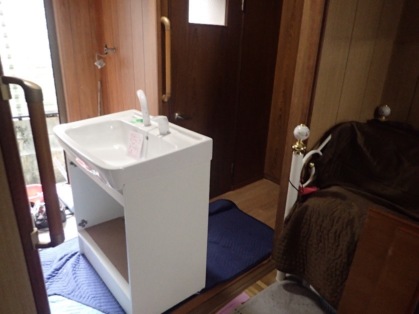 | 屋内に洗濯スペースがなく、浴室からホースを引っ張り給水し、排水も浴室にと大変不便な状況。 古くなった洗面化粧台もポタポタと水が止まらなくなっていました。 |