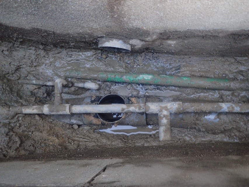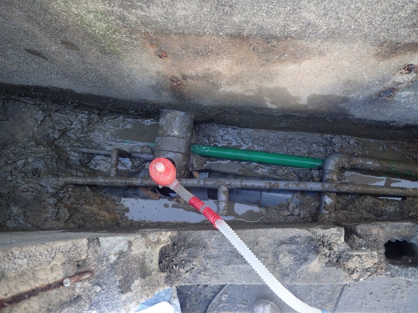 | 元々は汲取りで家庭用排水は雑排水で放流していたところを20数年前に下水道に切替えたようです。 その際、既存のコンクリート枡に耐水モルタルで成型し、雑排水配管は現状で利用、トイレ部の枡のみ 新設で既存に接続されておりました。 勾配がついておらず、配管内で油分が固まり完全に詰まり、あふれ出た排水は土中に染み込み ジュクジュク状態です。 犬走りのコンクリートを斫ると悪臭がたちこめます。至急改修することとなりました。 |