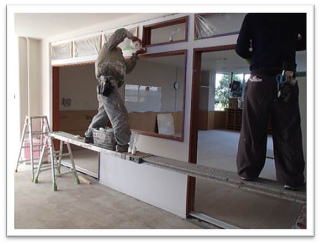 ホール側壁は既設壁同様、ボンタイルを吹付けます。実際の吹付面積より開口の方が多いですが、汚れないようにきっちりと養生していきます。 |