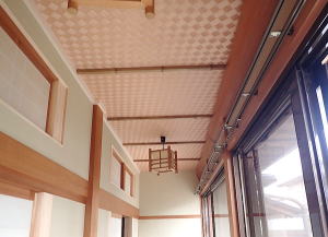 縁側の天井にはアジロ天井を使用♪ 和の風合いを壊さず、スッキリ明るく完成しました♪ |